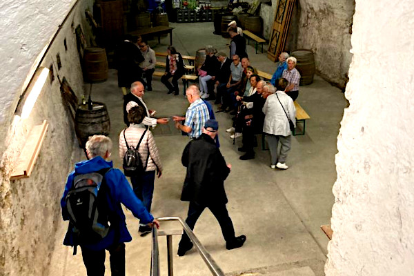 Vor dem Kloster hatte unser Landsknecht für uns eine kleine Überraschung. Er entnahm seiner Ledertasche eine kleine Dose mit einem Gebäck – ein Aphrodisiakum aus dem Mittelalter. Jeder bekam ein Versucherli. Ob es wohl gewirkt hat …? Unser Landsknecht fand per Zufall in seiner Tasche auch einen Schlüssel zu einem Vorhängeschloss, welches ein Kellertor neben dem Kloster zierte. Nach dem Öffnen des Schlosses konnten wir einen Keller mit Tonnengewölbe betreten, einen Weinkeller mit Sitzgelegenheit. Letzteres war sehr angenehm, konnten wir doch ein Gläschen Weisswein und weitere Geschichten aus dem Mittelalter geniessen.